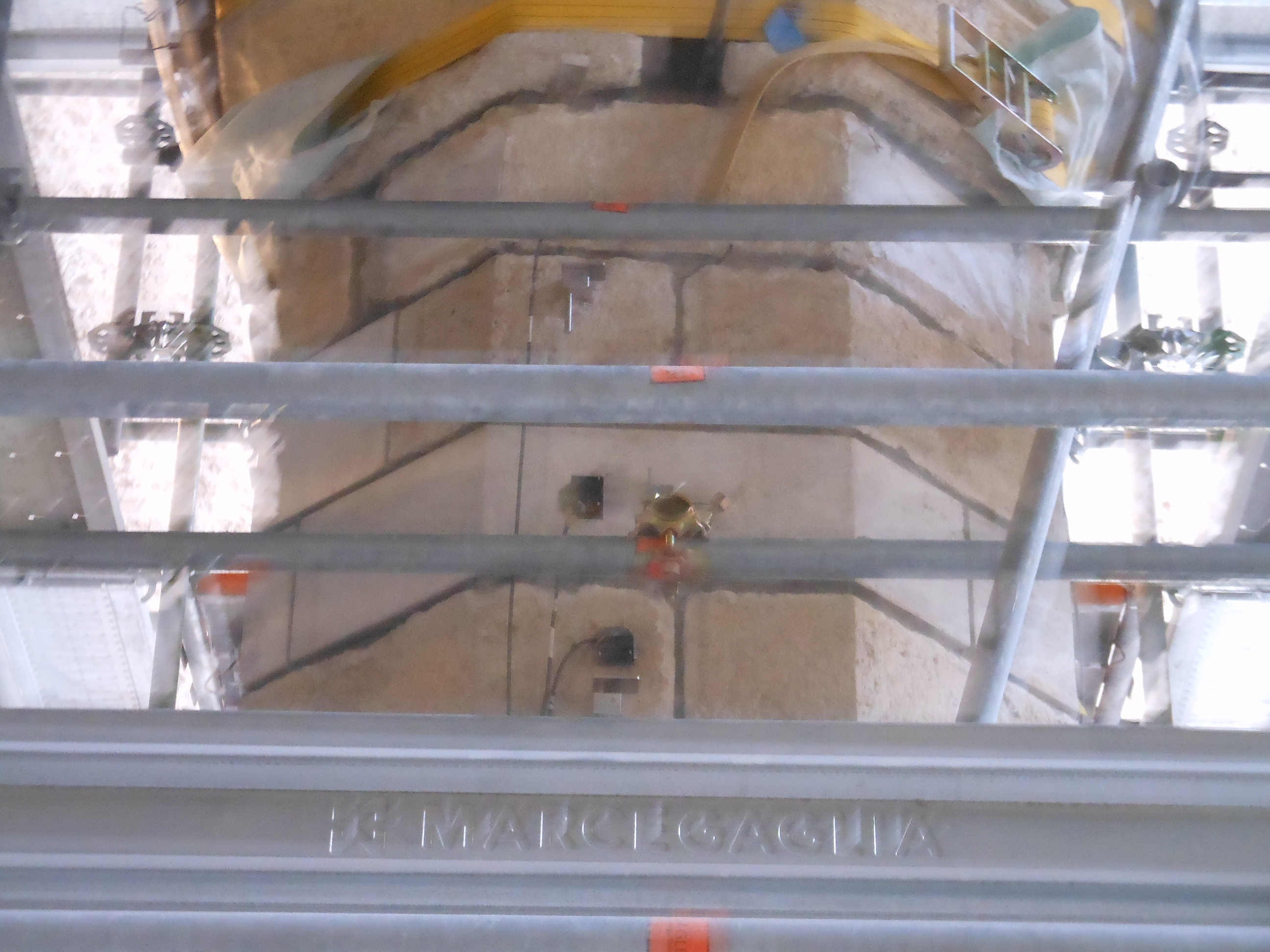 Lavori si Ristrutturazione della Basilica di Santa Maria di Collemaggio, L’Aquila, danneggiata dal sisma 2009. Monitoraggio strumentale delle colonne oggetto di consolidamento nella fase di riapplicazione del carico. Prove di carico su pali; prove di scarico su colonne e pilastri; estrazione barre.
